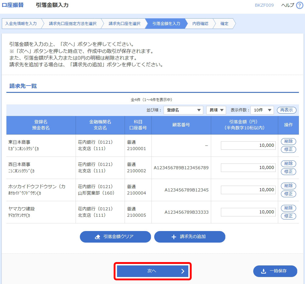 全ての請求先の引落金額を入力し、[次へ]ボタンをクリックしてください。