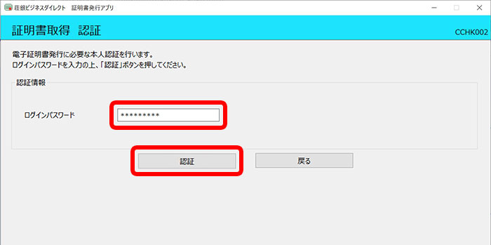 「ログインパスワード」を入力し、「認証して発行」ボタンをクリックしてください。