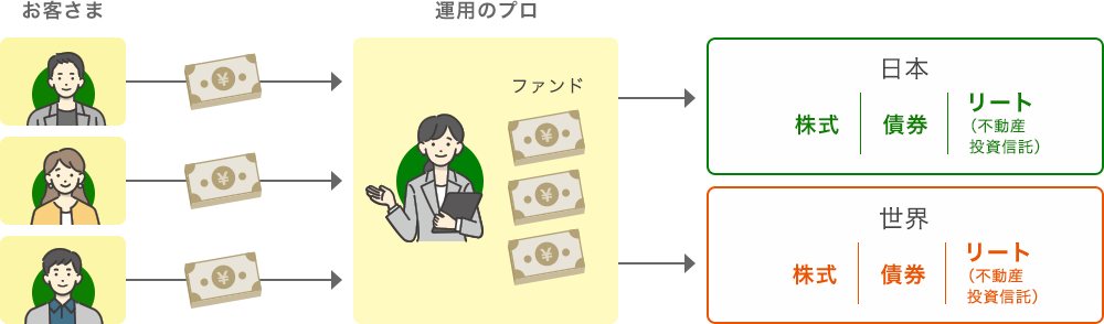 投資信託とは、お客さまからお預かりした資金を大きく一つにまとめ、運用のプロ(専門家)が、お客さまに代わって国内外の債券や株式などに分散して投資し、その運用成果をお客さまに分配する仕組みの金融商品です。